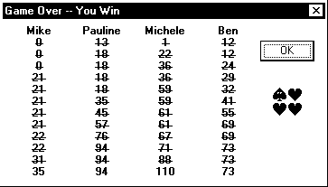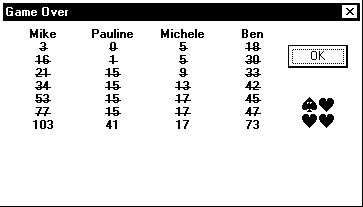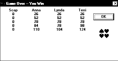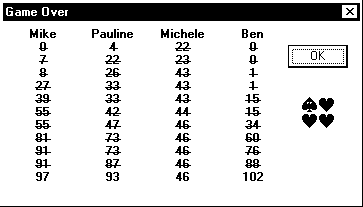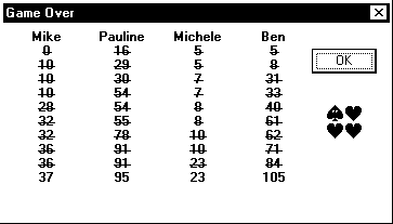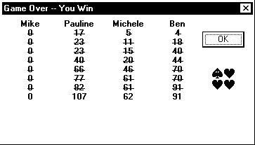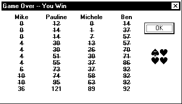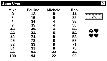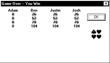 up the scores (29+22+14+39=104), and 104 divided by 26 gives us 4. If someone had shot the moon, the scores would be higher.